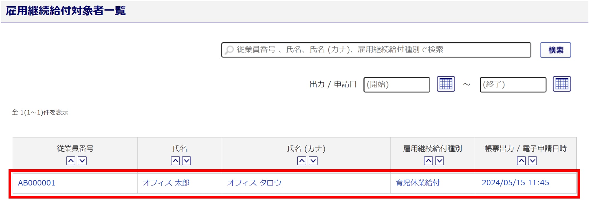 雇用継続給付対象者一覧画面の表示