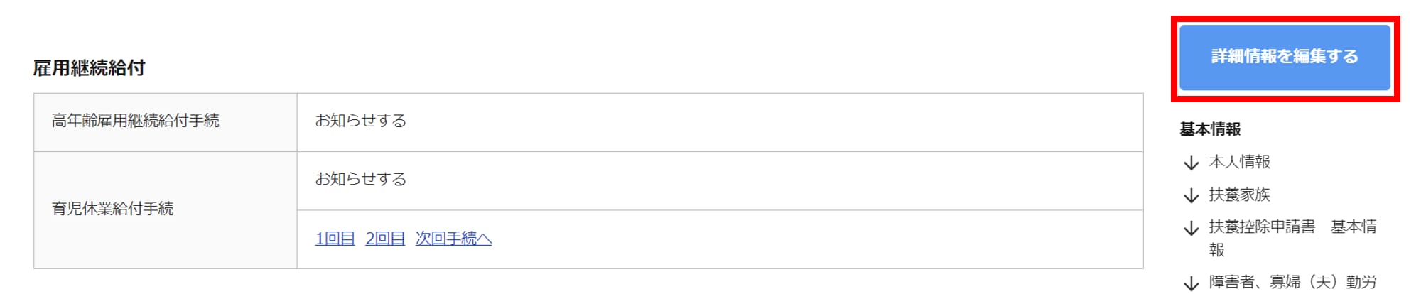 - メインページ「[雇用継続給付対象者一覧へ移動する]」をクリックします。