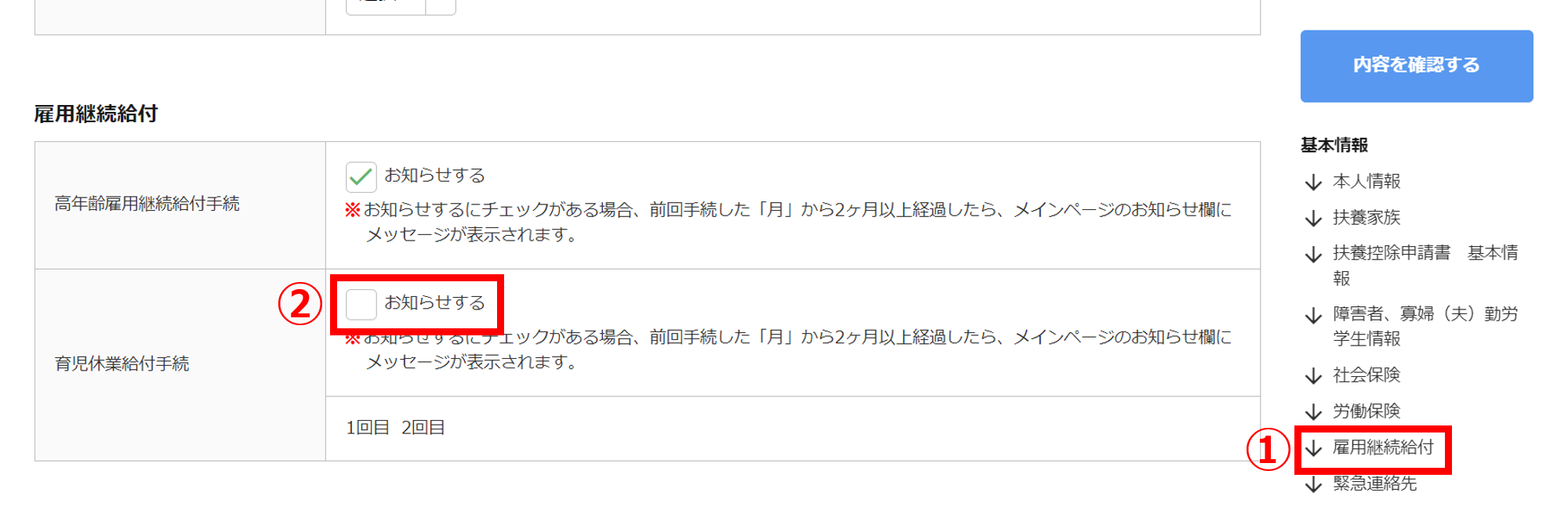 - 「雇用継続給付」(①)>[お知らせする](②)のレ点チェックを外します。※「育児休業給付手続」もしくは「高年齢雇用継続給付手続」どちらの場合でも操作は同じです。