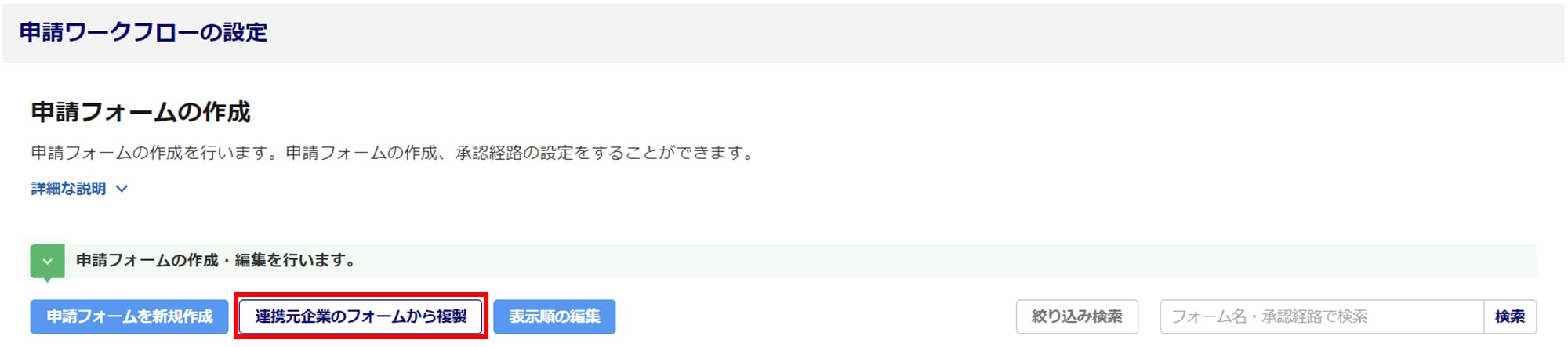 「対応項目がない項目のみ表示する」にチェックすると、赤い背景の項目のみが表示されます。 - 画面上部に「申請フォームを複製しました。」と表示され、一覧に複製した申請フォームが表示されます。複製して作成した申請フォームの「申請フォーム名」は、「元の名称(親会社名)」となります。