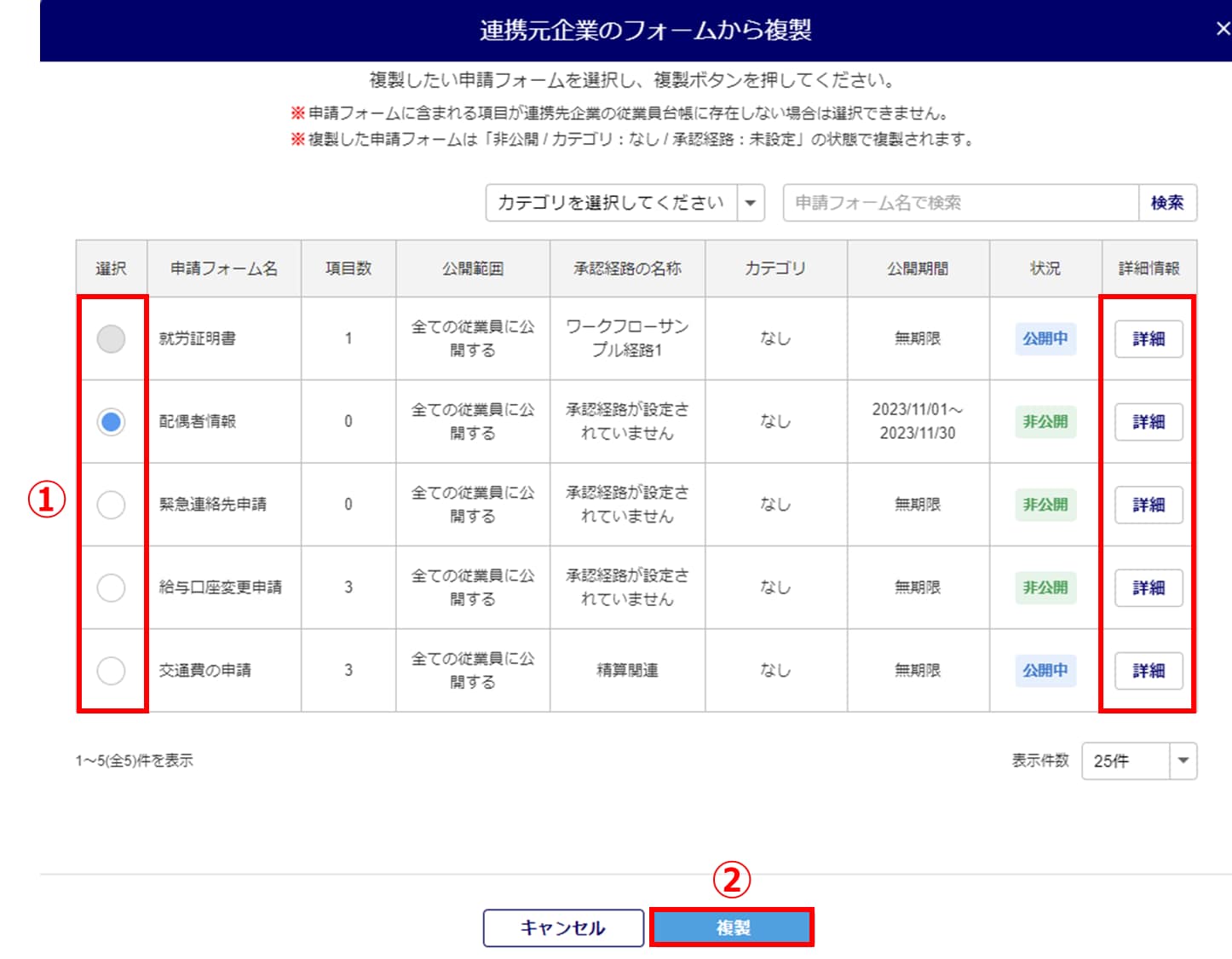 ホールディングス連携をしている親会社の申請フォーム一覧が表示されます。 - 「選択」列(①)から複製する申請フォームを選択し、[複製](②)をクリックします。※複製元の申請フォーム内に設定している従業員台帳の項目が、子会社側に設定がない場合、「選択」欄がグレーアウトします。