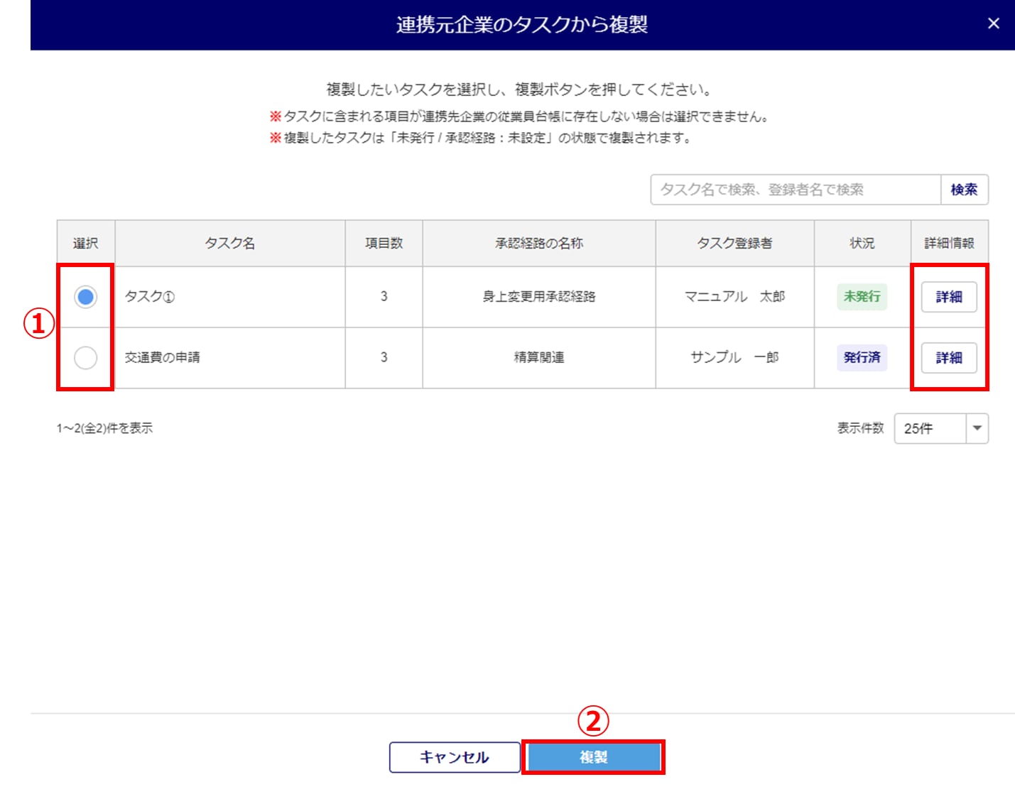 ホールディングス連携をしている親会社の申請タスク一覧が表示されます。 - 「選択」列(①)から複製する申請タスクを選択し、[複製](②)をクリックします。※複製元の申請タスク内に設定している従業員台帳の項目が、子会社側に設定がない場合、「選択」欄がグレーアウトします。