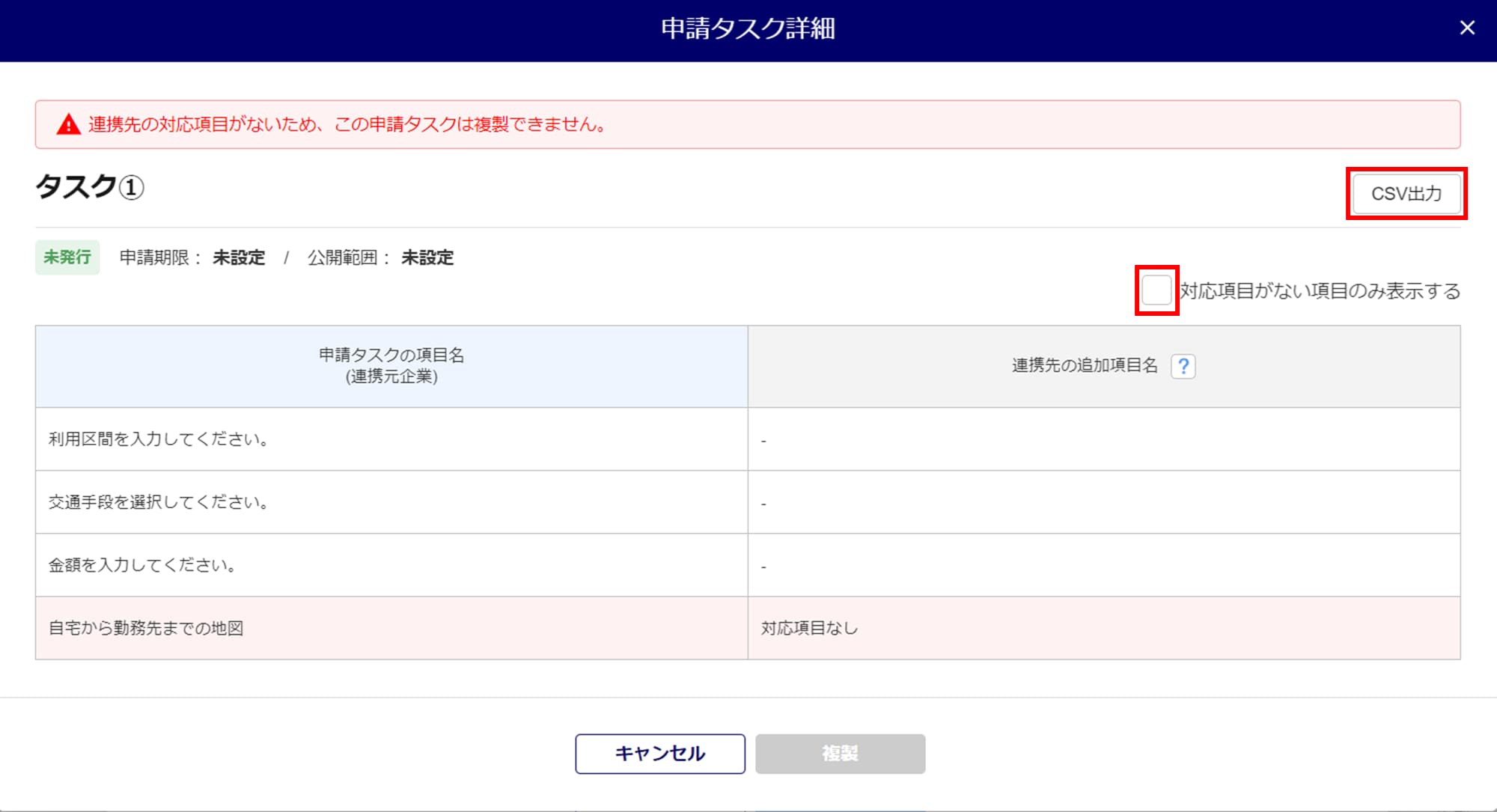 「対応項目がない項目のみ表示する」にチェックすると、赤い背景の項目のみが表示されます。 - 画面上部に「申請タスクを複製しました。」と表示され、一覧に複製した申請タスクが表示されます。複製して作成した申請タスクの「タスク名」は、「元の名称(親会社名)」となります。