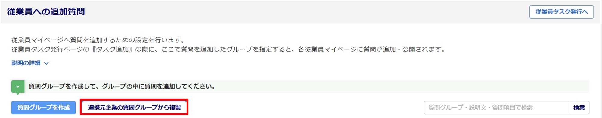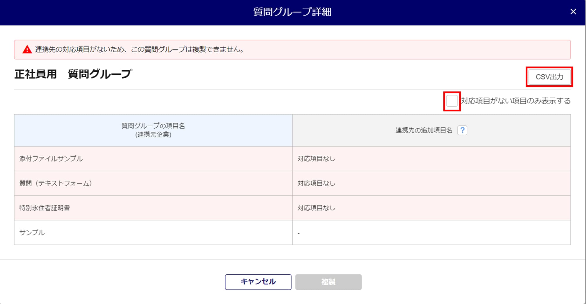 「対応項目がない項目のみ表示する」にチェックすると、赤い背景の項目のみが表示されます。 - 一覧に複製した追加質問が作成されます。複製して作成した追加質問の「質問グループ名」は、「元の名称(親会社名)」となります。