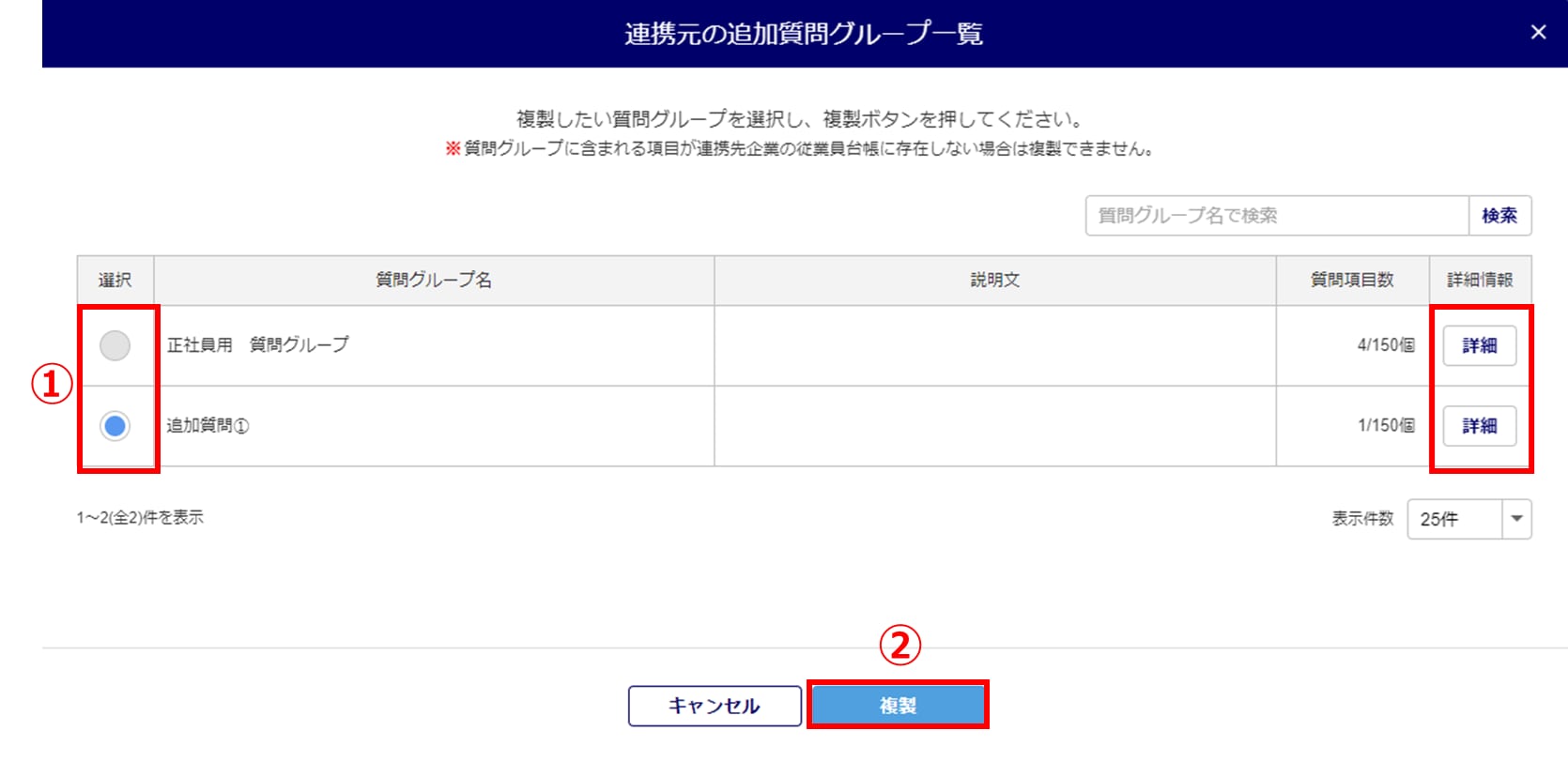 ホールディングス連携をしている親会社の追加質問グループ一覧が表示されます。 - 「選択」列(①)から複製する追加質問グループを選択し、[複製](②)をクリックします。※複製元の追加質問グループ一覧内に設定している従業員台帳の項目が、子会社側に設定がない場合、「選択」欄がグレーアウトします。