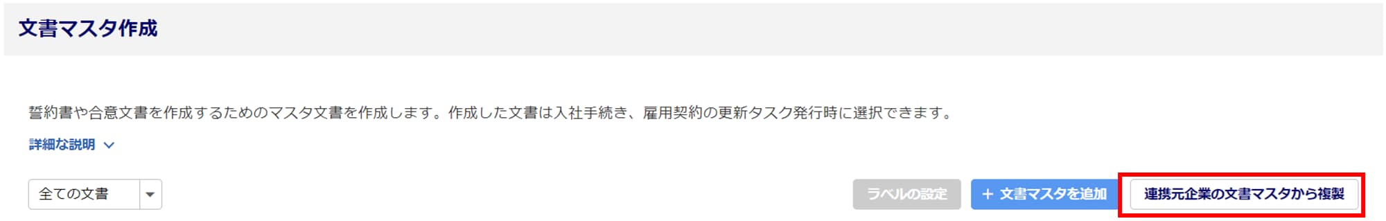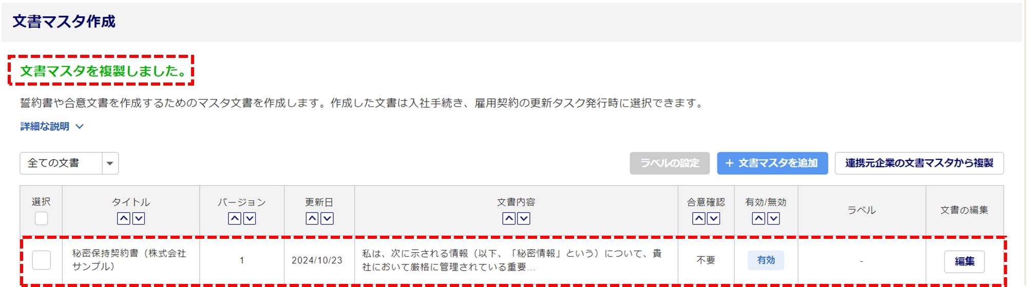 - 画面上部に「文書マスタを複製しました。」と表示され、一覧に複製した文書マスタが表示されます。複製して作成した文書マスタの「タイトル」は、「元の名称(親会社名)」となります。