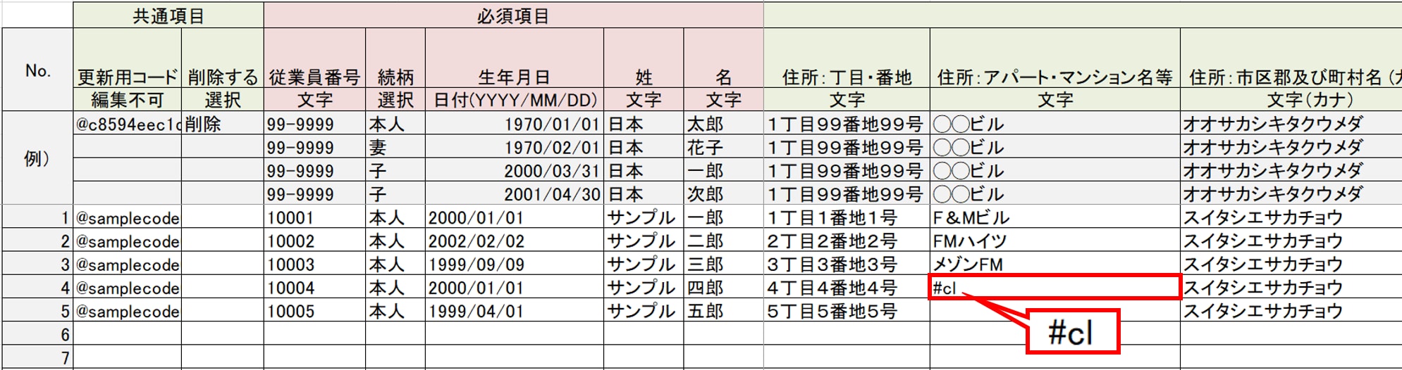 「従業員台帳一括編集」方法 - ダウンロードしたテンプレートファイルを開きます。空白で更新する項目の対象セルに、半角小文字で「#cl」と入力します。「#cl」(全角)や「#CL」(大文字)と入力した場合も、アップロード時に「#cl」へ自動変換され、空白で更新することが可能です。