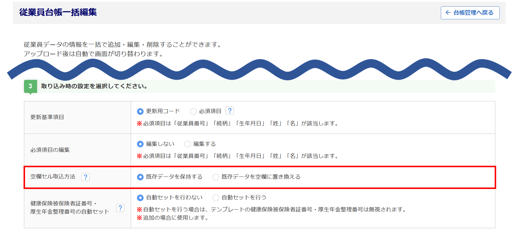 - 「3.取り込み時の設定を選択してください。」の「空欄セル取込方法」に、「既存データを保持する」を選択します。