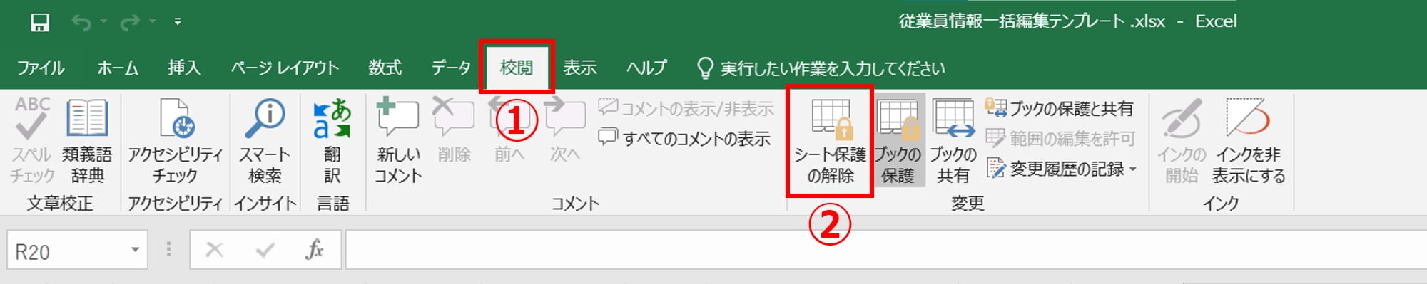 [校閲]タブ(①)から[シート保護の解除](②)をクリックします。