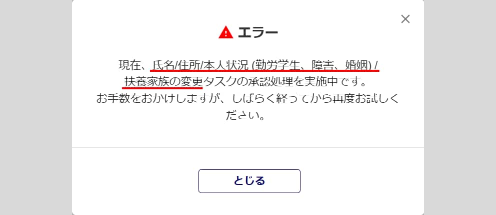 例)「氏名/住所/本人状況(勤労学生、障害、婚姻)/扶養家族の変更タスク」の一括承認処理を実施中に、「氏名/住所/本人状況(勤労学生、障害、婚姻)/扶養家族の変更タスク」の一括承認処理を実施