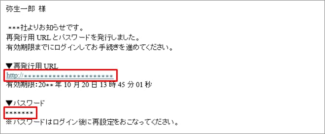 - URLの有効期限は30分間です。有効期限を経過した場合、パスワードの再発行操作を再度お願いします。なお、パスワードの再発行操作は、メール下部に記載されているURLからおこなえます。