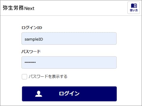 なお、迷惑メールフォルダにもメールが届いてい場合は、勤務先の担当者へお問い合わせください。 - 「件名:[弥生労務 Next]再発行用URLとパスワードのお知らせ」メールを開き、記載されているURLをクリックします。表示されたログイン画面にメールに記載の「パスワード」と、ログインIDを入力してログインします。