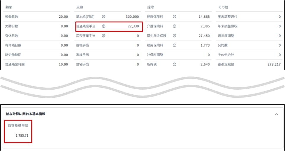 2,233円×普通残業時間(10時間)=22,330円(1円未満端数切り上げ:22,330円)明細(入力)画面の計算結果