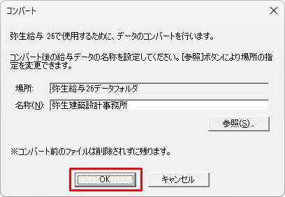 弥生給与(やよいの給与計算) 26で使用するために、データのコンバート(変換)を行います。[OK]をクリックして、コンバート(変換)を行ってください。