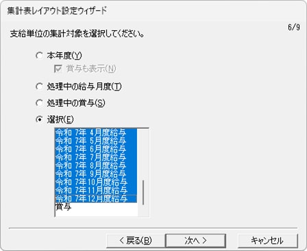 [選択]を選択し、令和7年4月度給与以降をすべて選択して、[次へ]をクリックします。このとき、賞与は選択しないでください。