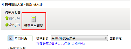 [年調明細個人別]-[通勤手当調整]をクリックし、金額を確認します。確認後は[×]または[キャンセル]をクリックして画面を閉じます。