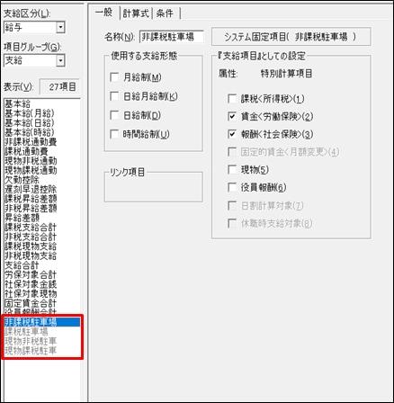 弥生給与(やよいの給与計算) 26にアップデートを行うと、駐車料金に関する以下の明細項目が追加されます。