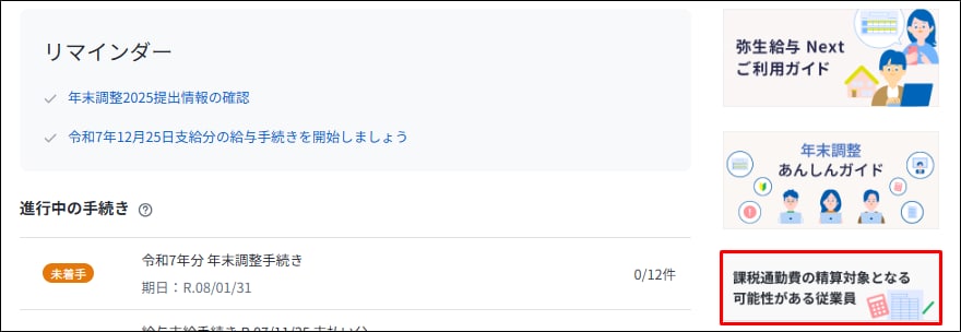2025年(令和7年)11月20日に施行された、交通用具使用者の通勤手当の非課税限度額引き上げに伴い、課税済み通勤手当の年末調整での精算が必要な従業員がいる場合は、ホーム画面から[課税通勤費の精算対象となる可能性がある従業員]を開いて調整額の計算を行います。