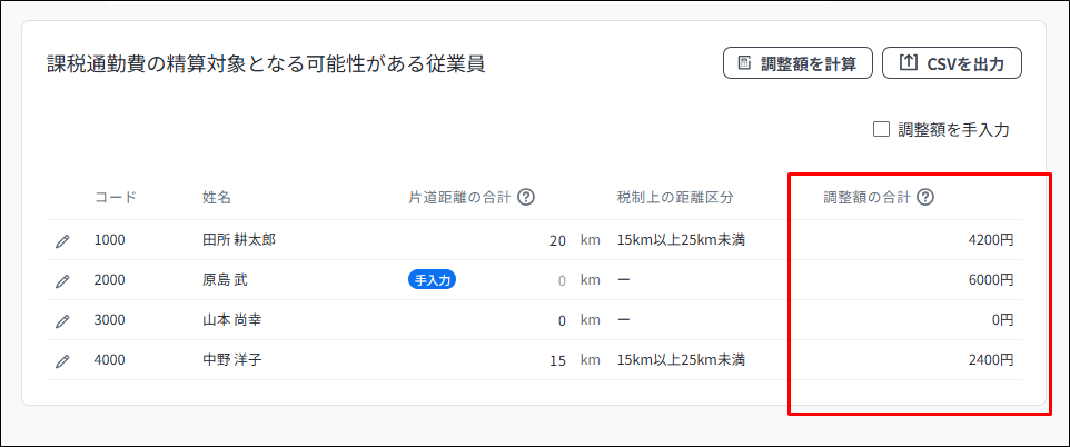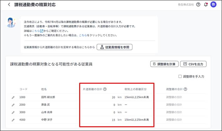税制上の距離区分は、片道距離の合計を基に自動表示されます。片道距離の合計が空欄の場合、入力すると調整額を計算することができます。