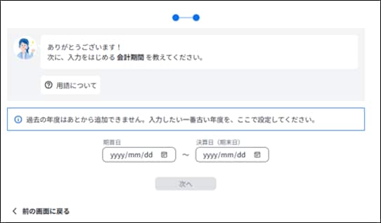 ここでは現在の会計期間ではなく、弥生会計 Nextへのデータのインポートや入力を行いたい、 一番古い年度の期首日と期末日を設定してください。既に弥生会計 Nextを使っている場合