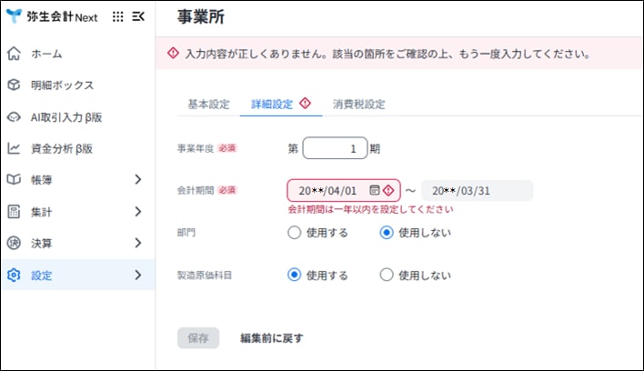 [詳細設定]タブでご希望の会計期間を設定したうえで[保存]をしてください。