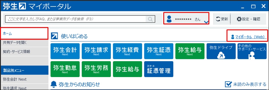マイポータル(Web)に管理者権限を持つ弥生IDでログインします。