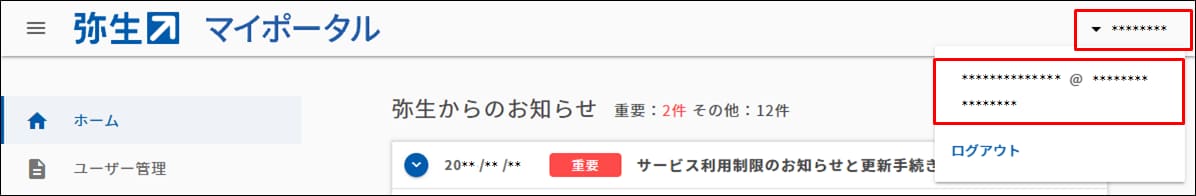 画面右上の「ログイン名」をクリックすると、利用している弥生ID(メールアドレス)を確認することができます。