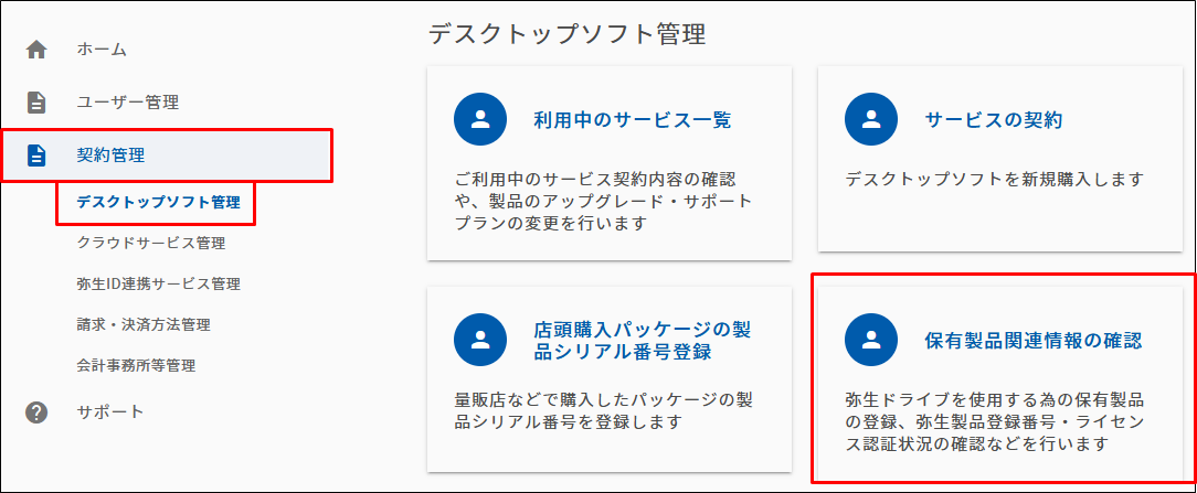 マイポータル(Web)で保有製品情報を確認します。[契約管理]の[デスクトップソフト管理]から[保有製品関連情報の確認]をクリックします。