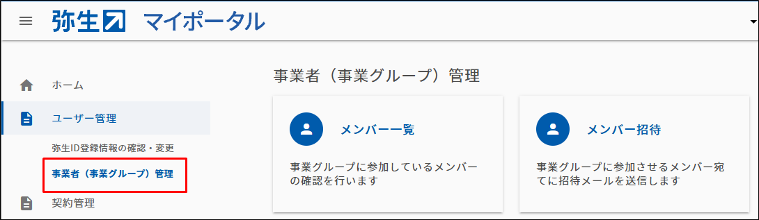 (手順4で[事業者(事業グループ)管理]が表示される場合のみ)[ユーザー管理]-[事業者(事業グループ)管理]-[メンバー一覧]をクリックして、同じ事業グループに参加しているメンバーと管理者の弥生IDを確認します。