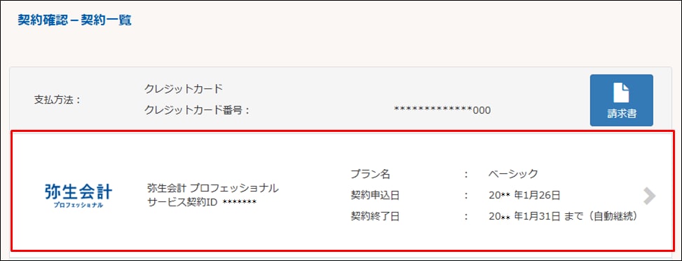 表示されたサービス契約ID(お客様番号)と製品名を確認します。今後も利用継続される最新製品※のサービス契約ID(お客様番号)をメモに控えます。