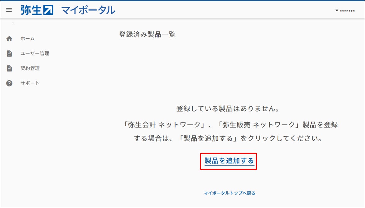 - マイポータル(Web)を開き、ネットワーク製品を登録したい事業グループの管理者の弥生IDでログインします。