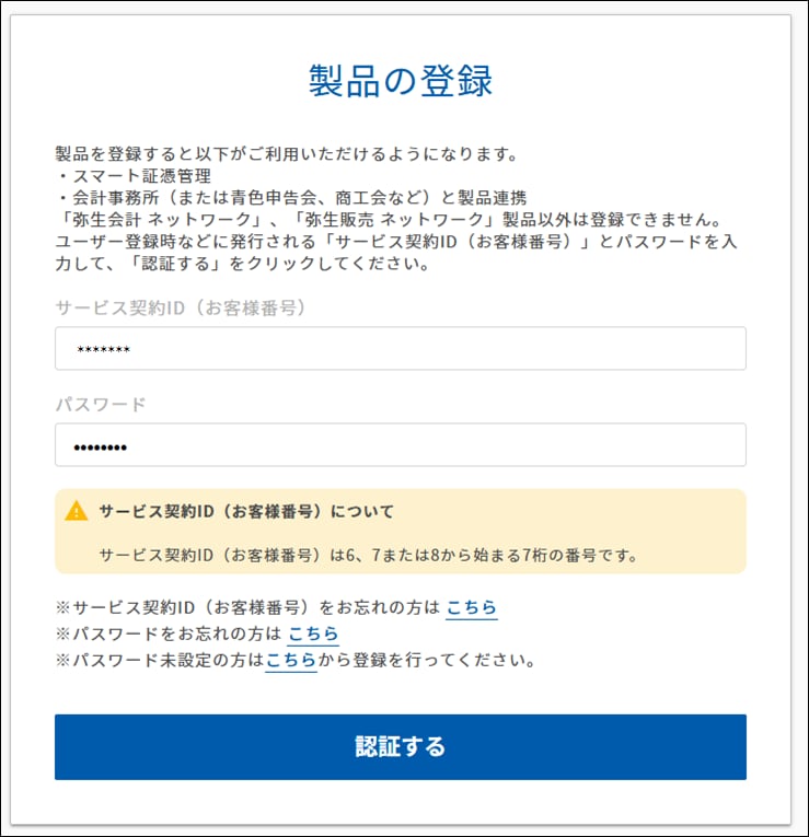 - 各製品のサービス契約ID(お客様番号)
