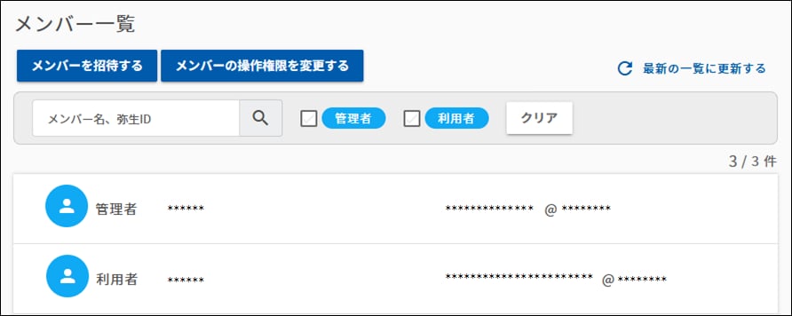 [メンバー一覧]では、事業グループに参加しているメンバーや各メンバーの操作権限を確認することができます。