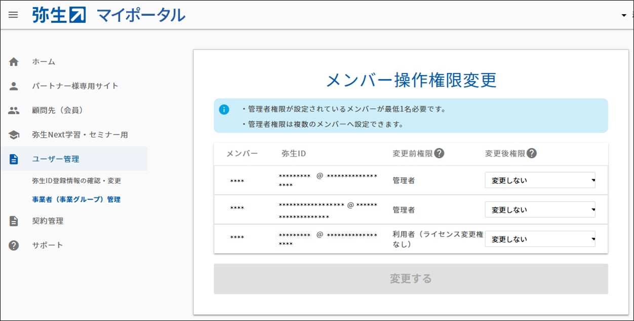 事業グループにメンバーを招待したい - 操作権限が正しくない場合、操作権限変更を行います。