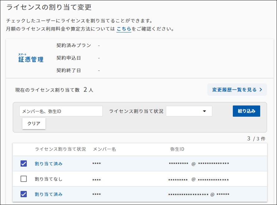 マイポータル(Web)に管理者権限を持つ弥生IDでログインしてライセンス割り当てを確認します。[契約管理]の[クラウドサービス管理]から[ライセンス割り当て]をクリックします。