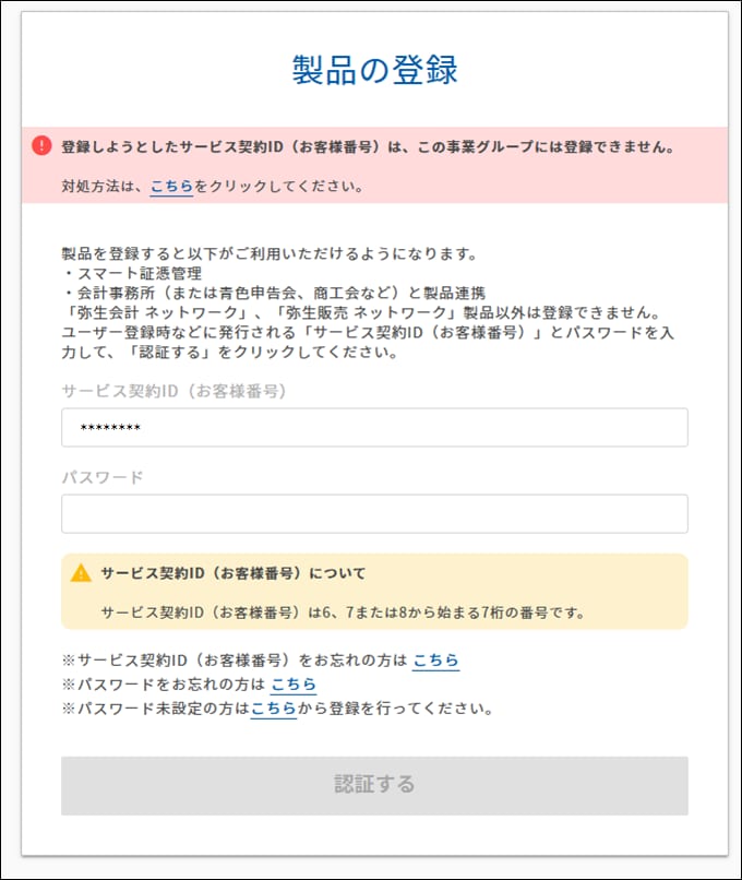 [認証する]をクリックした際に「登録しようとしたサービス契約ID(お客様番号)は、この事業グループには登録できません。」