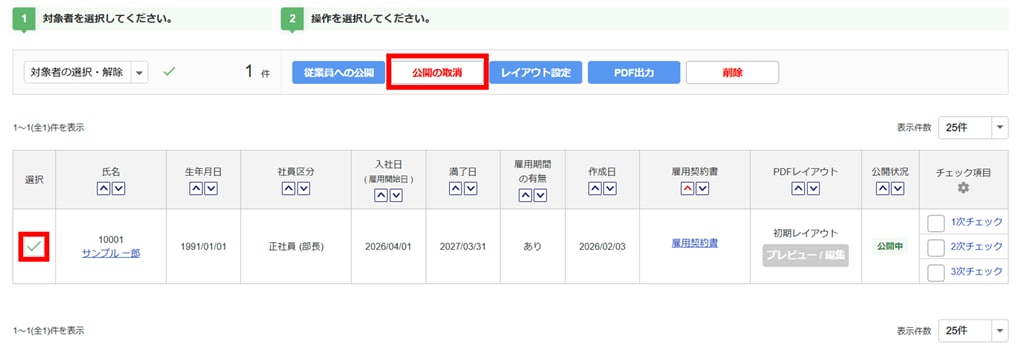 - 対象の雇用契約書の「選択」列にチェックをつけ、[公開の取消]をクリックします。