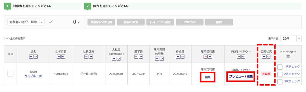 - 公開状況が「非公開」になったら、[編集]または[プレビュー/編集]より、雇用契約書を修正することができます。