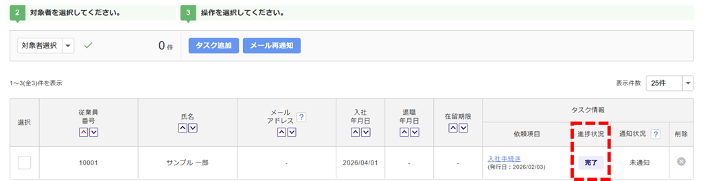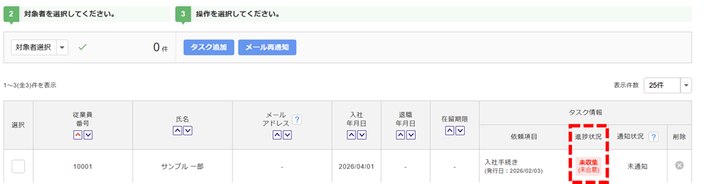 従業員へタスクを発行している場合、タスクの進捗状況に応じて対応します。