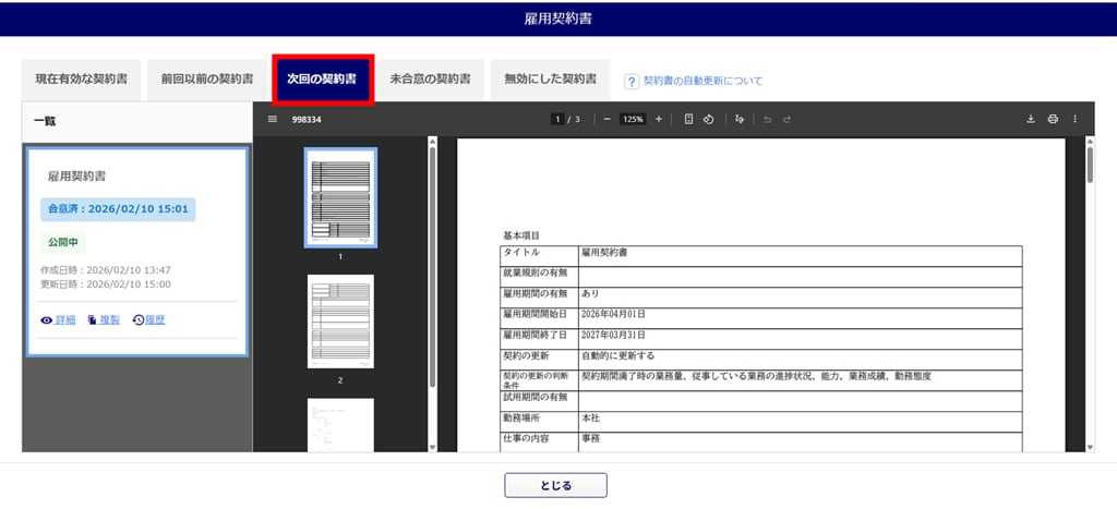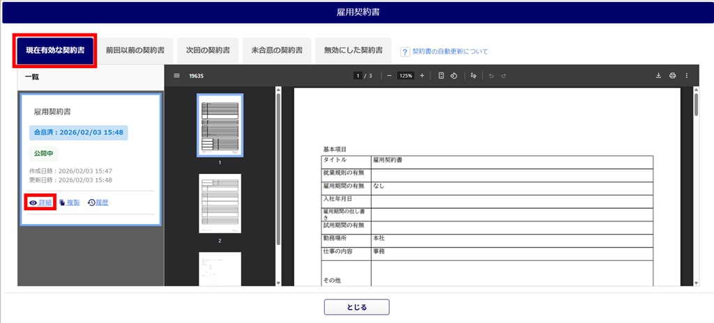 - 雇用契約書のステータスが「現在有効な契約書」の場合
