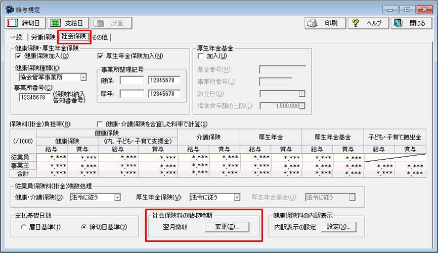 [社会保険料の徴収時期]が「当月徴収」「翌々月徴収」の場合は、以下を参照してください。