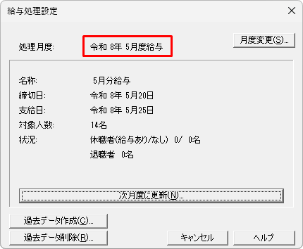 - [給与処理設定]画面の[処理月度]が「令和8年(2026年)5月度給与」と表示されていることを確認します。