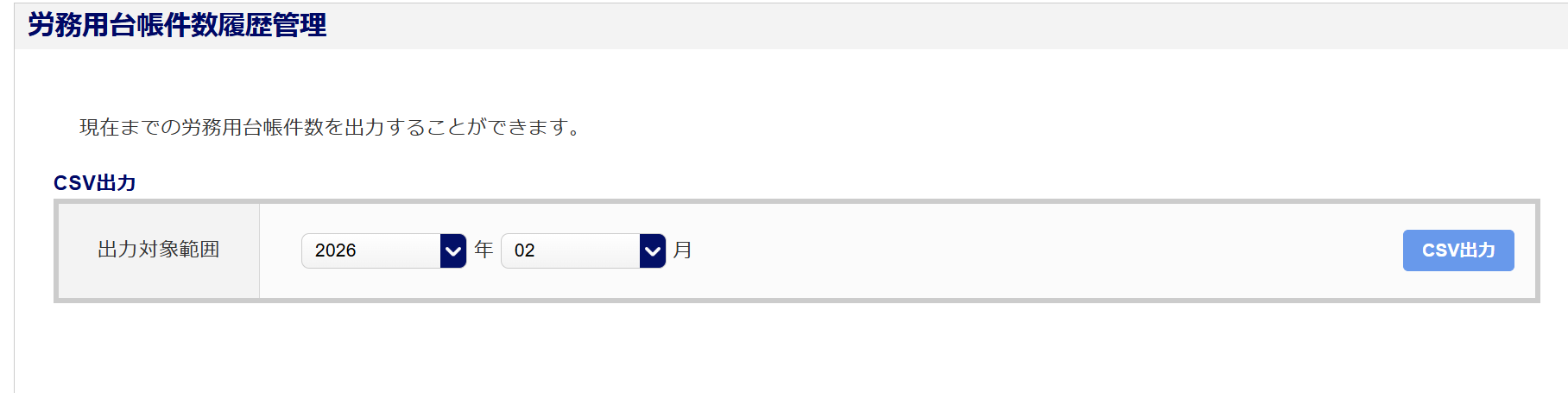 その他>台帳・オプション登録件数CSV出力>労務用台帳件数履歴管理から、過去の登録数を含めて確認できます。