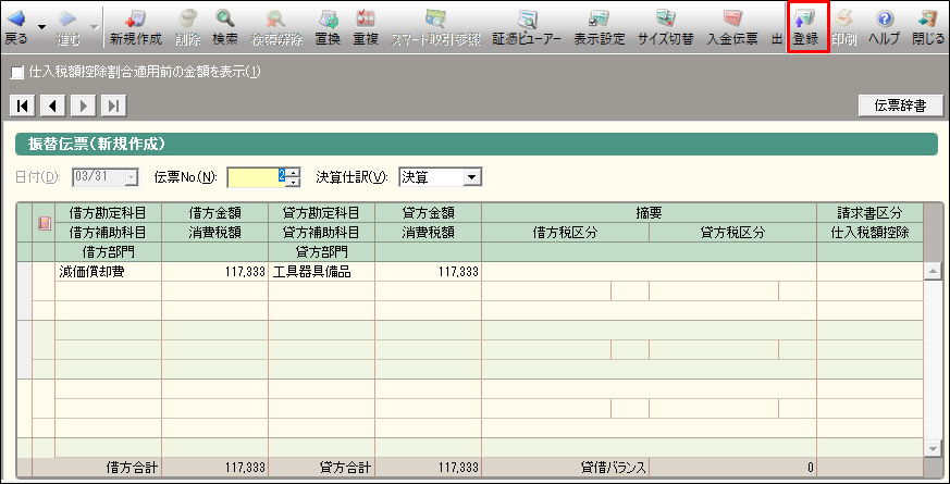 - [振替伝票]が表示されたら[登録]をクリックします。