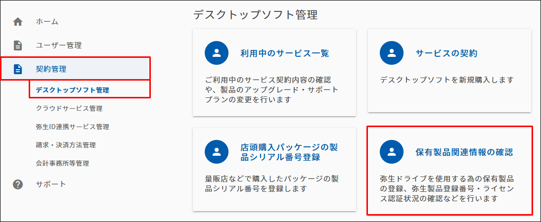 [契約管理]-[デスクトップソフト管理]の[保有製品関連情報の確認]をクリックします。