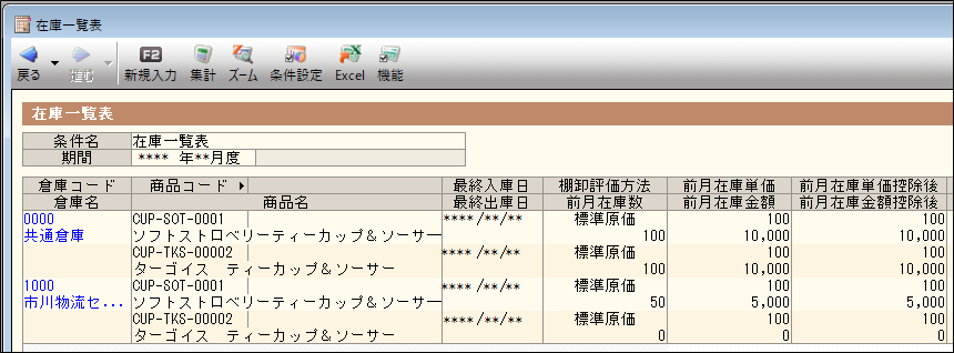 倉庫ごとの在庫数を確認するには、以下の手順で集計条件を設定します。