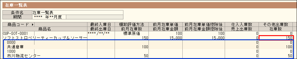 事業所全体の在庫数は赤枠内の[在庫数]に表示されます。(事業所全体の在庫数は必ず表示されます)