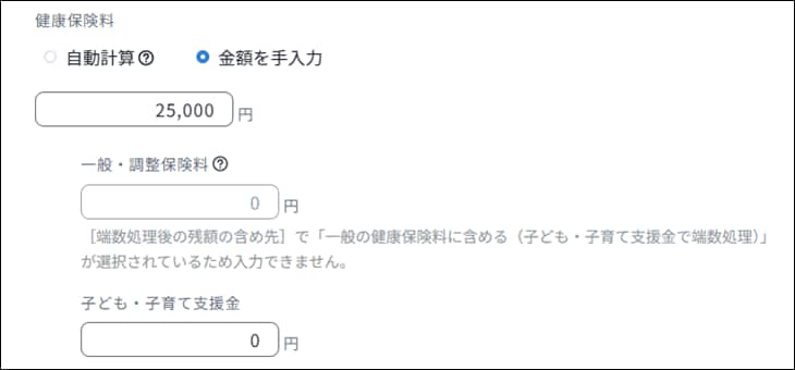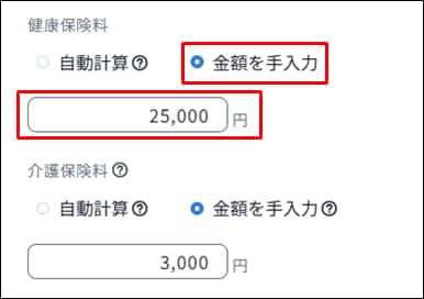 [健康保険料]で「金額を手入力」を選択して、設定したい金額を入力します。