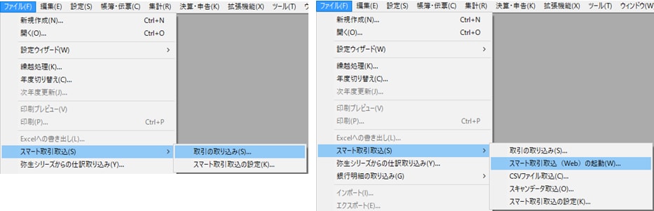 - [ファイル]メニューの[スマート取引取込]-[取引の取り込み]、または[スマート取引取込(Web)の起動]をクリックします。