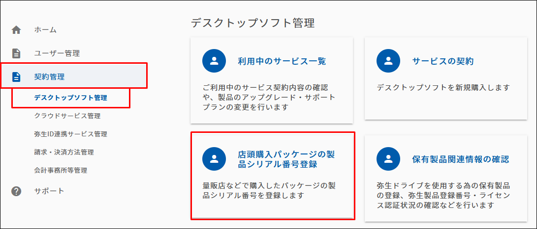 - [契約管理]-[デスクトップソフト管理]から[店頭購入パッケージの製品シリアル番号登録]をクリックします。